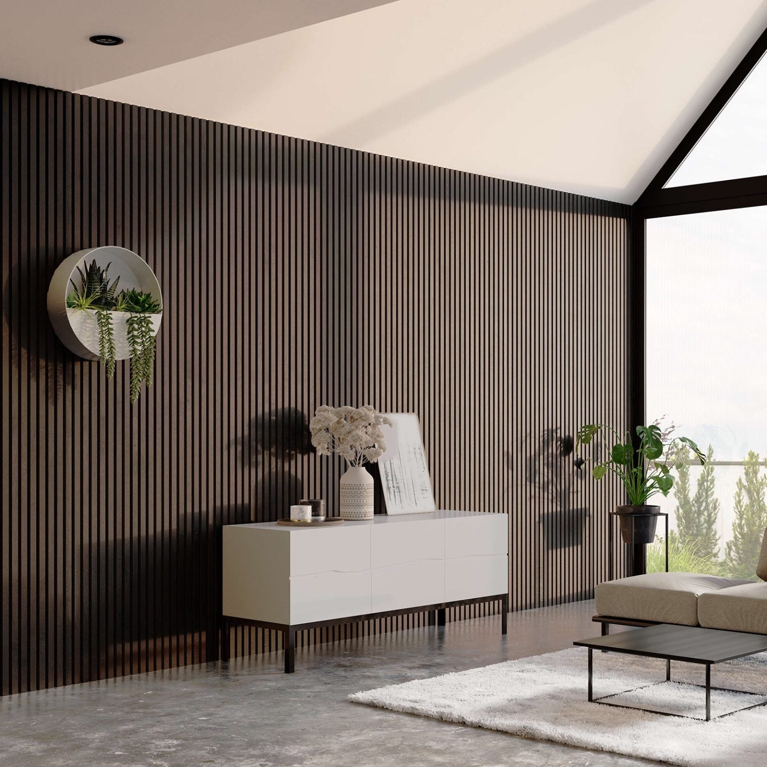 Transform your space with PANELUX™ 9' panels, designed to elevate any room with a sleek wood slat wall that adds sophistication and enhances height and openness.
